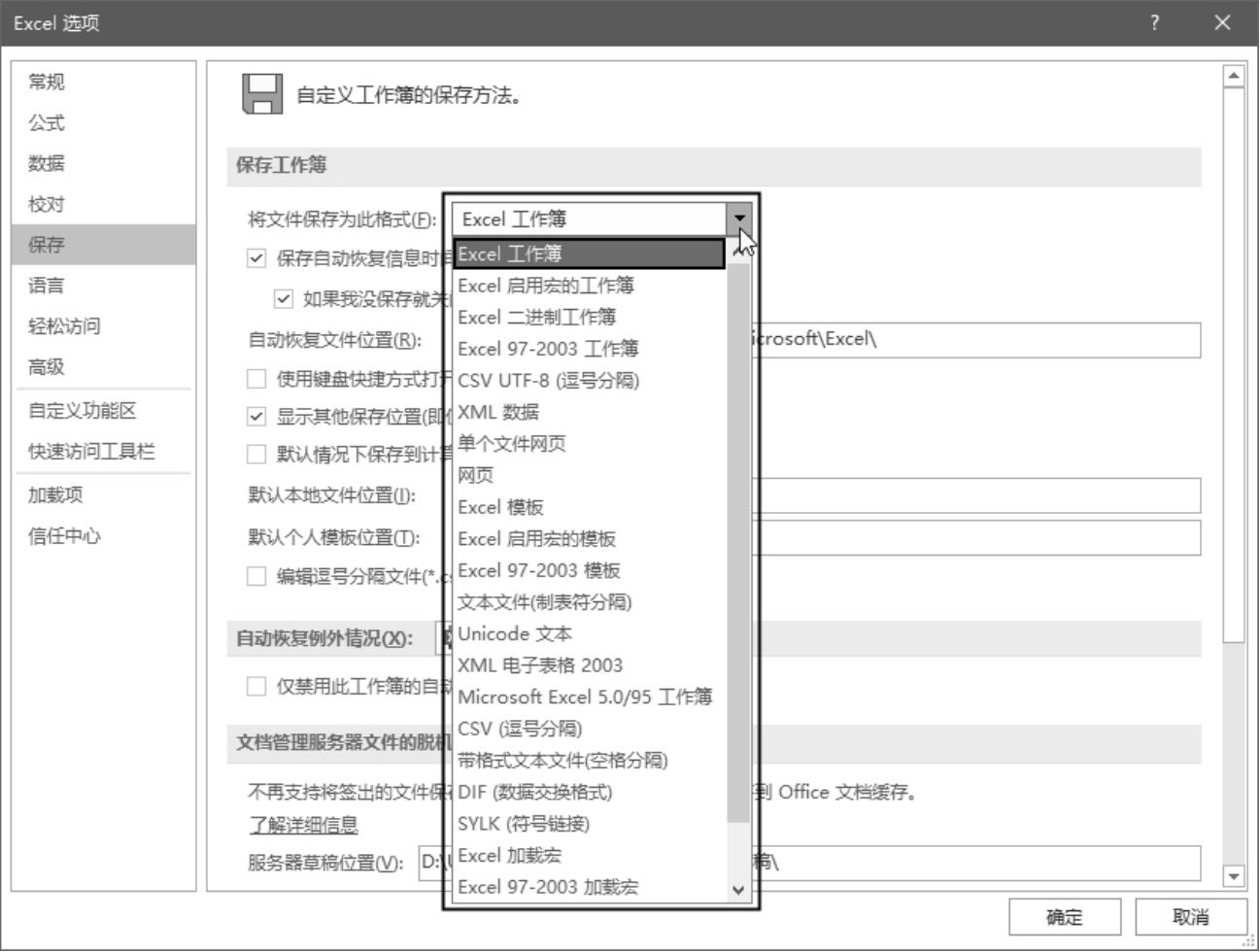 (2)打开“Excel选项”对话框,在“保存”选项卡的“将文件保存为此格式”下拉列表中选择所需的文件格式,然后单击“确定”按钮,如图2-54所示。