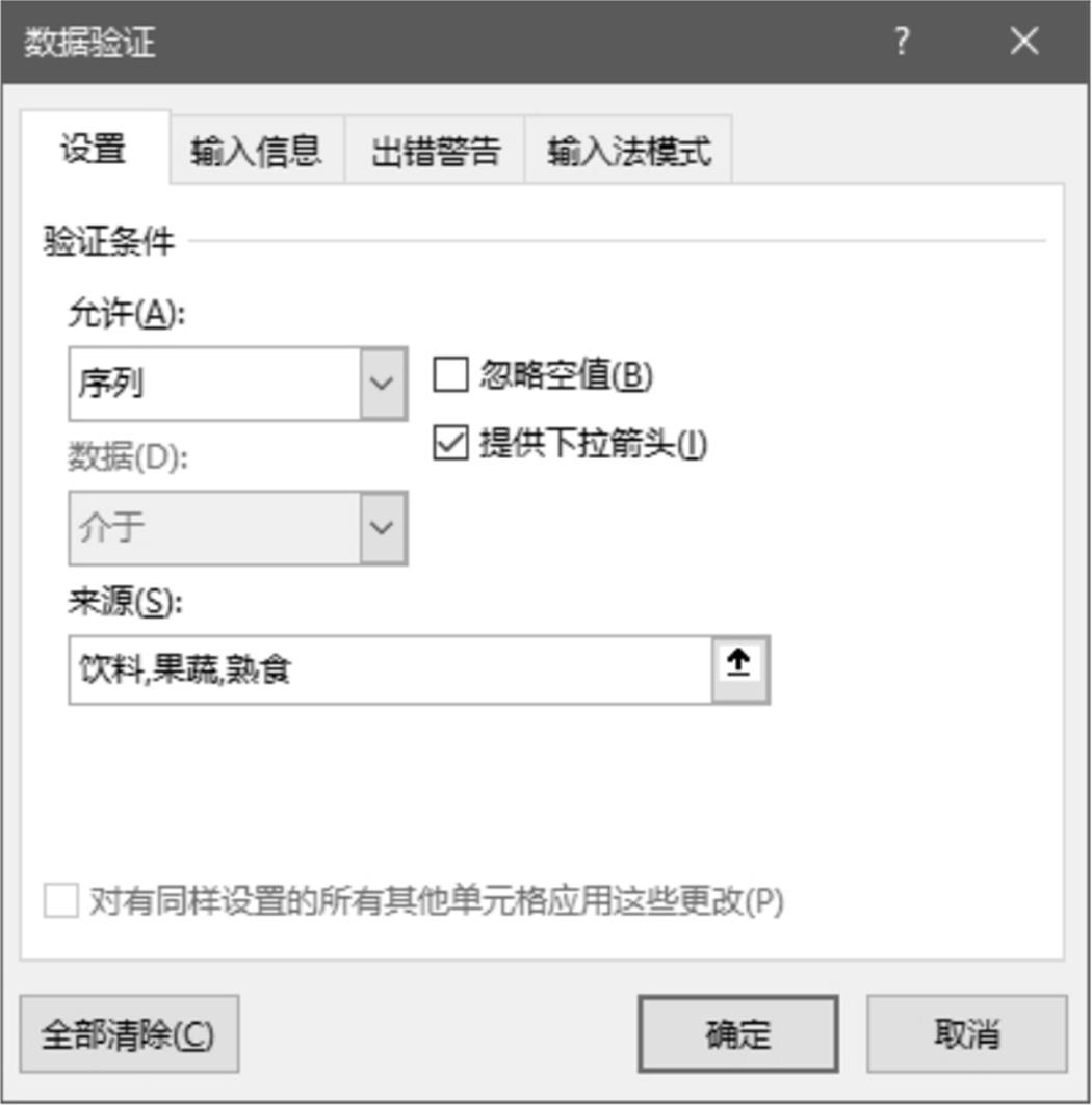 ●在“来源”文本框中输入“饮料,果蔬,熟食”,文字之间的逗号需要在英文半角状态下输入。如需在文本框中移动插入点的位置,需要按F2键进入“编辑”模式。