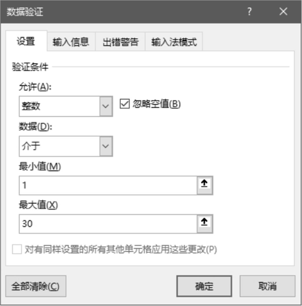 在“数据验证”对话框中的每个选项卡的左下角都有一个“全部清除”按钮,单击该按钮将清除所有选项卡中的设置。下面将介绍几种常用的数据验证规则的设置方法。