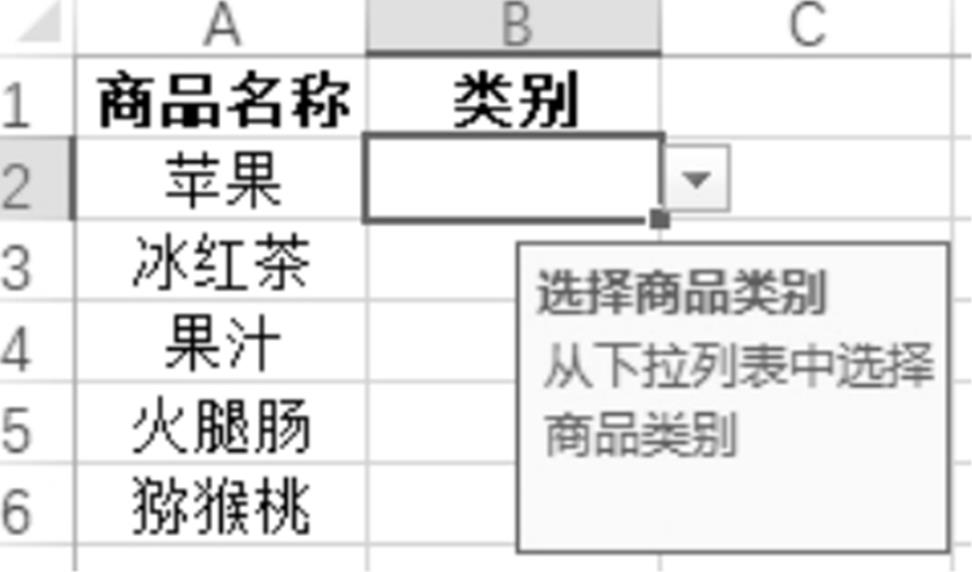 当选择B2:B6区域中的任意一个单元格时,将自动在单元格中显示一个下拉按钮,并显示提示信息,如图3-7所示。单击该按钮,将打开一个下拉列表,其中包含“饮料”“果蔬”和“熟食”三项,选择其中之一,即可将选择的选项输入到单元格中,如图3-8所示。