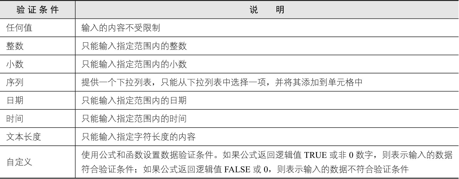 如需实现灵活的数据验证方式,可以使用表3-1中的“自定义”验证条件。此时需要使用公式来检测输入的数据是否符合规则,如果公式的结果是逻辑值TRUE或非0数字,则表示符合规则;如果公式的结果是逻辑值FALSE或0,则表示不符合规则。