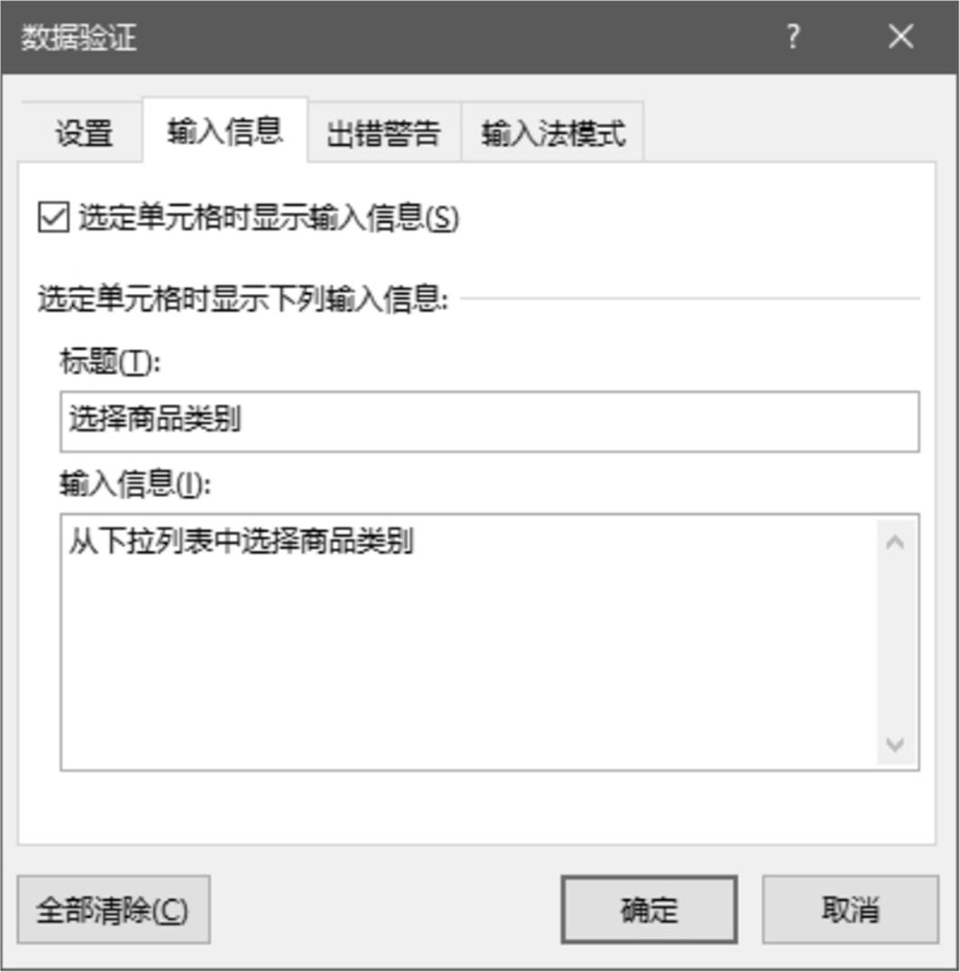 ●“输入信息”选项卡:当选择包含数据验证规则的单元格时,设置要向用户显示的提示信息,以便让用户了解应该输入什么类型的数据。