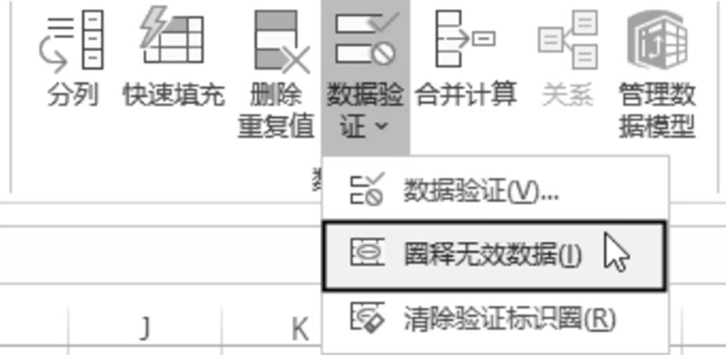 如需清除标记,可以在功能区的“数据”选项卡中单击“数据验证”按钮的下拉按钮,然后在弹出的快捷菜单中选择“清除验证标识圈”命令。