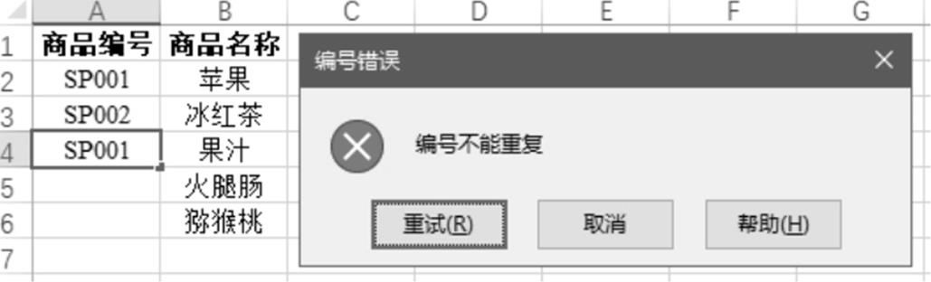 在A2:A6区域中输入商品编号时,如果输入了重复的编号,则会显示出错警告信息,如图3-14所示。