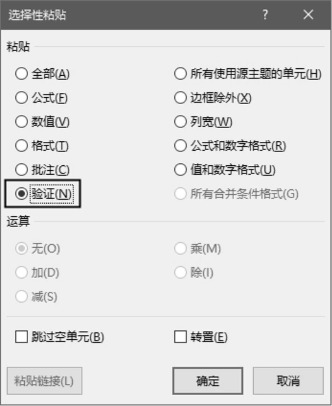 当复制包含数据验证规则的单元格时,将同时复制该单元格中的内容和数据验证规则。如果只想复制单元格中的数据验证规则,则可以使用“选择性粘贴”功能,为此需要打开“选择性粘贴”对话框,然后选择其中的“验证”选项,如图3-18所示。