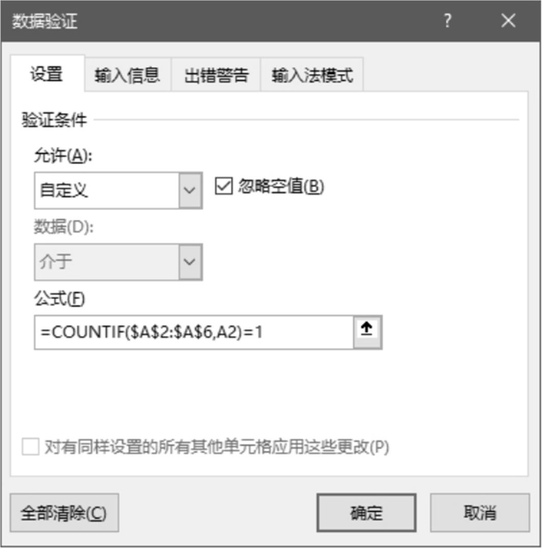 提示: 将A2单元格设置为相对引用,是因为上述公式会逐一对A2:A6单元格区域的每一个单元格中的数据进行检测。为了从A2单元格移动到A3单元格时,公式中的A2能够自动变成A3,所以公式中的A2需要使用相对引用。以便它可以根据公式移动的相对位置而自动调整行号。有关公式、相对引用和COUNTIF函数的详细内容,请参考第5章。