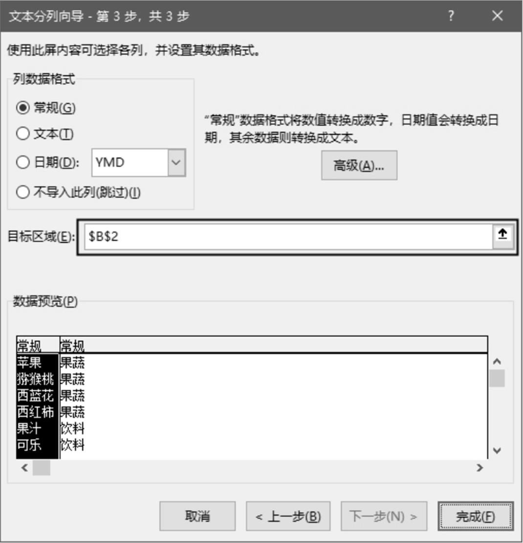 (5)显示如图3-26所示的界面,在“目标区域”文本框中指定分列后数据区域左上角的位置,然后单击“完成”按钮,将B列数据拆分为两列。为拆分后的两列数据设置合适的列标题,如图3-27所示。