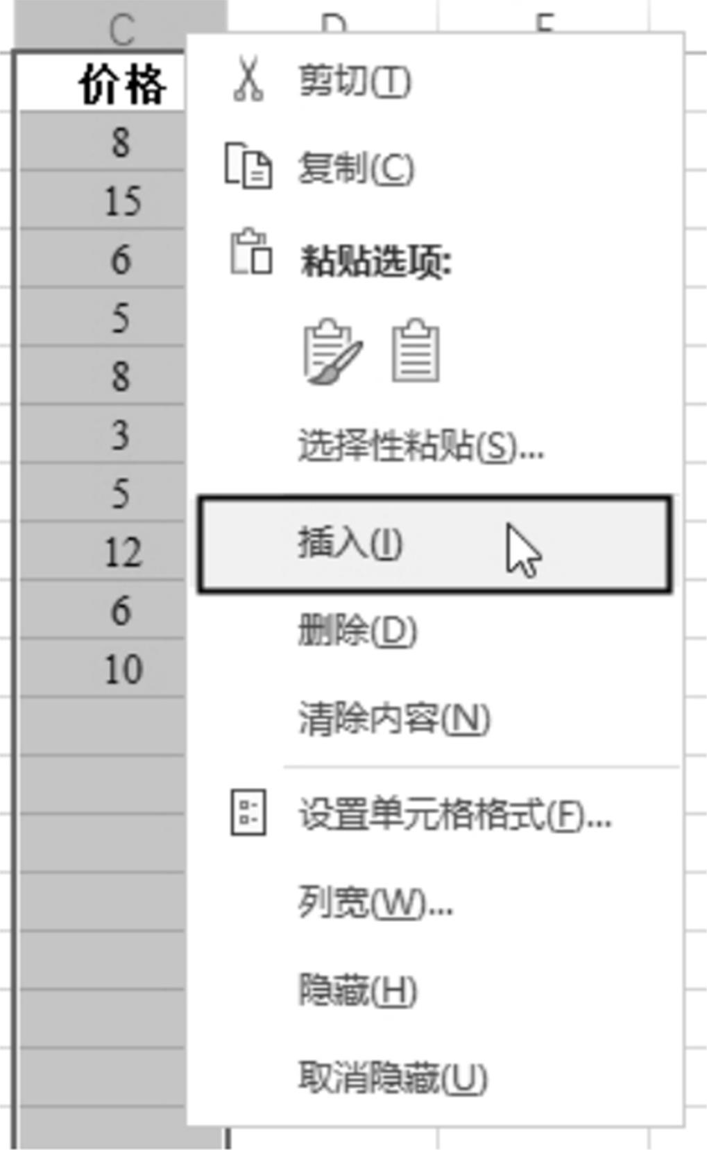 (1)右击C列顶部的列标,在弹出的快捷菜单中选择“插入”命令,在B、C两列之间插入一个空列,如图3-22所示。执行该操作是因为将B列内容拆分为两列后,其中的一列会覆盖原来的C列,为了避免出现这种情况,需要提前插入一个空列。