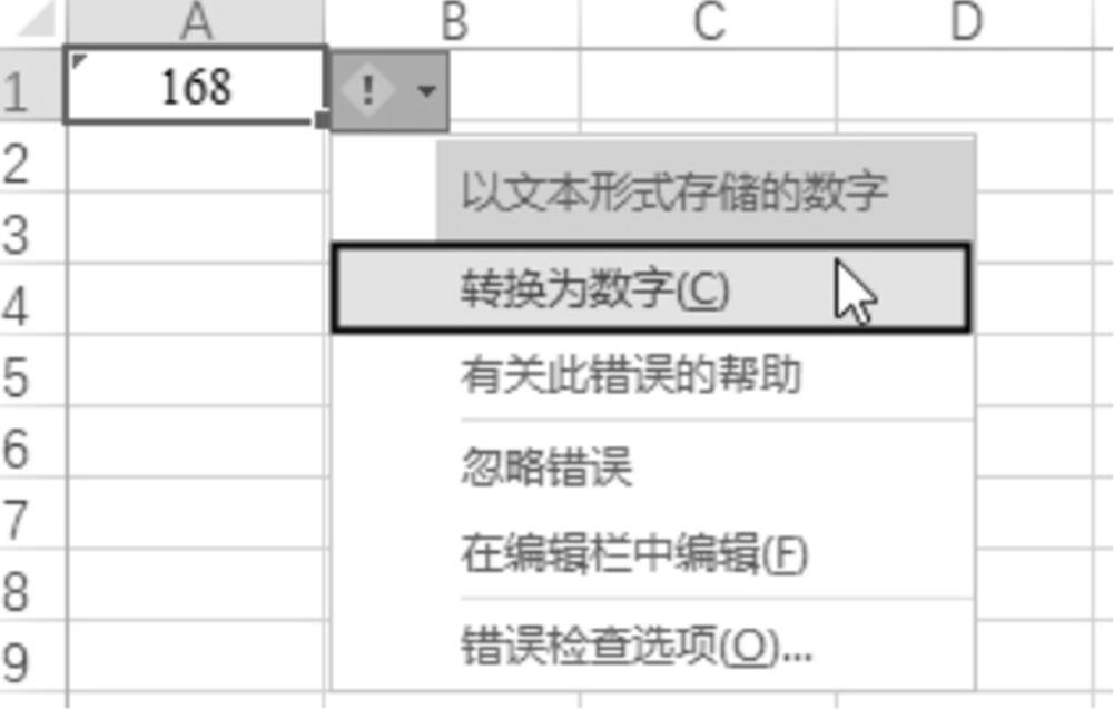 按钮,单击该按钮,在弹出的快捷菜单中选择“转换为数字”命令,如图3-33所示。