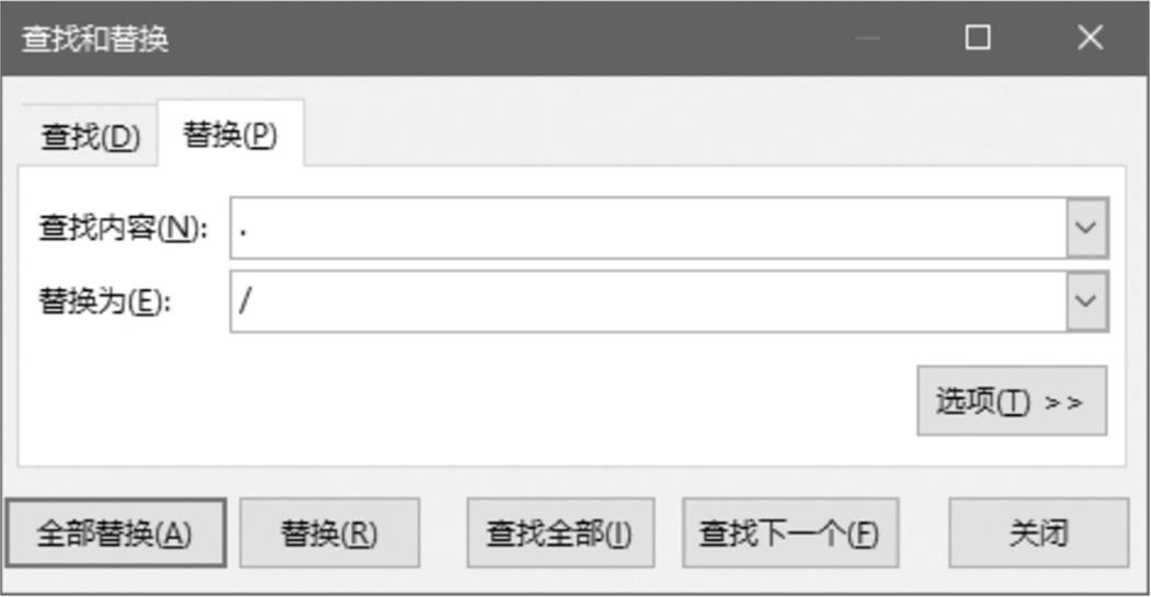 (2)打开“查找和替换”对话框中的“替换”选项卡,在“查找内容”文本框中输入“.”,在“替换为”文本框中输入“-”或“/”,然后单击“全部替换”按钮,如图3-30所示。