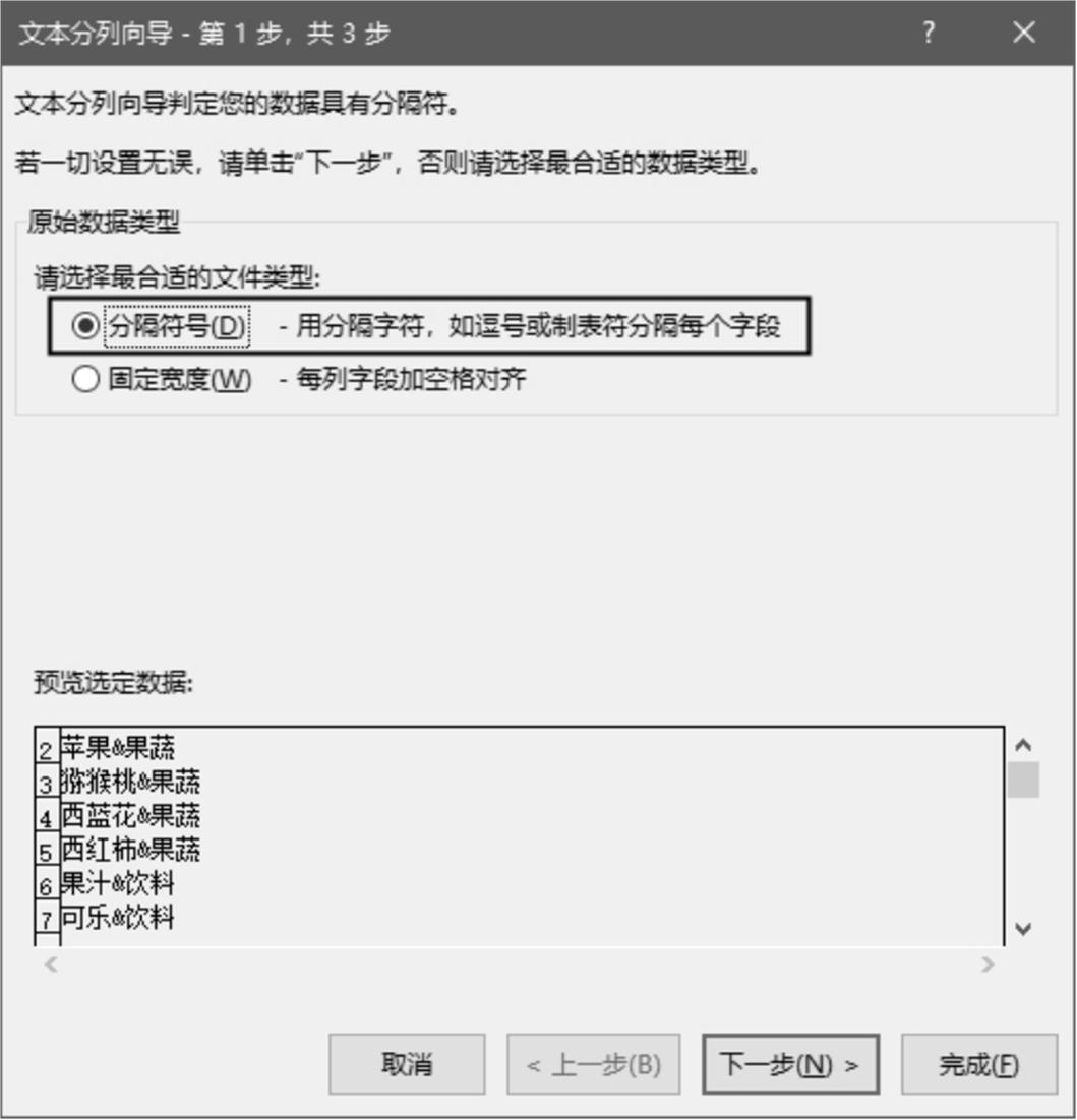 (3)打开“文本分列向导”对话框,选择“分隔符号”单选按钮,然后单击“下一步”按钮,如图3-24所示。