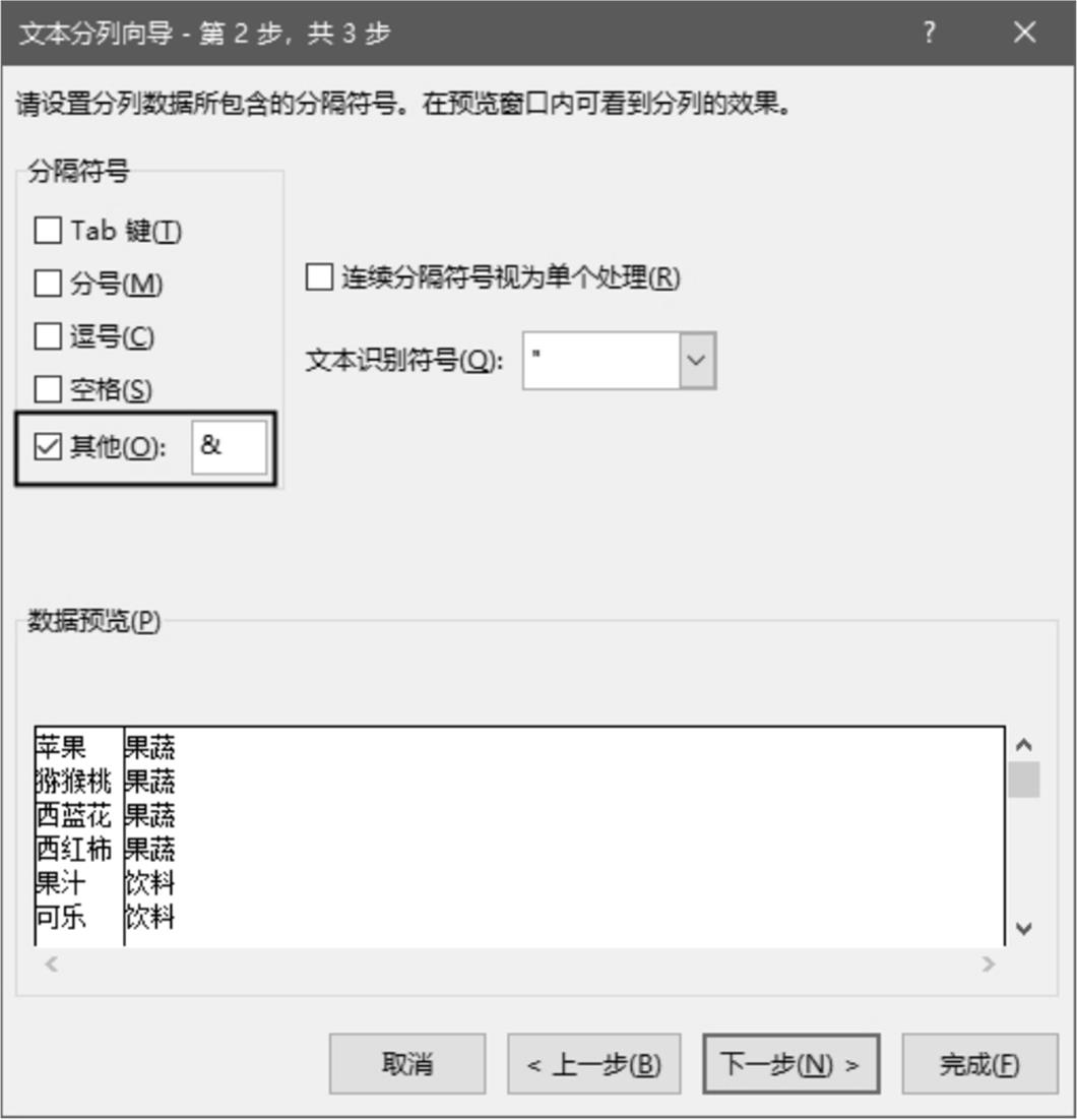 (4)显示如图3-25所示的界面,只勾选“其他”复选框,并在右侧的文本框中输入“&”,然后单击“下一步”按钮。