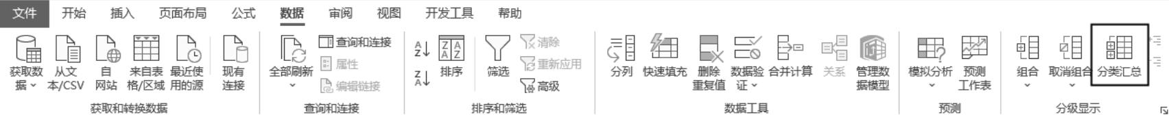 “分类汇总”工具位于Excel功能区的“数据”选项卡中,如图1-6所示。使用该工具可以对数据按照一个或多个特定的类别划分,并自动计算分类数据的数值总和、个数、均值、最大值和最小值等。“分类汇总”工具可以在普通数据区域中使用。
