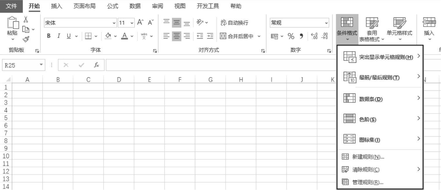 虽然条件格式与图表和迷你图的功能截然不同,但是由于条件格式也能从外观上改变数据的显示效果,所以也可以将其看作是一种数据可视化工具。使用“条件格式”工具可以为满足条件的数据自动设置字体、边框、填充色等格式,以达到突出显示特定数据的目的。“条件格式”工具位于Excel功能区的“开始”选项卡中,如图1-16所示。