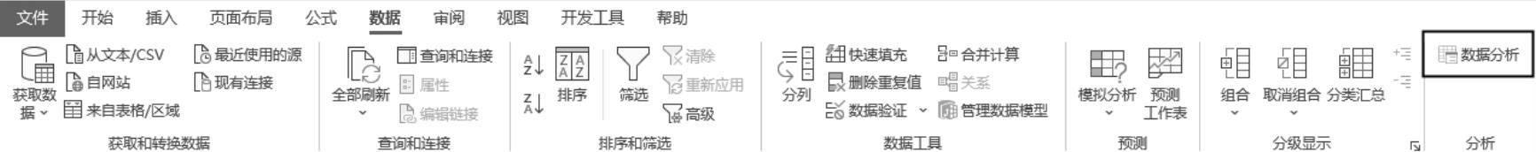 “分析工具库”工具位于Excel功能区的“数据”选项卡中,如图1-12所示,使用该工具前需要先安装“分析工具库”加载项。使用“分析工具库”工具可以对数据进行统计分析和工程计算。