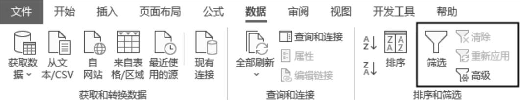 “筛选”工具位于Excel功能区的“数据”选项卡中,如图1-4所示。使用该工具可以快速找出符合条件的数据。无论哪种类型的数据,它们都有一些相同的筛选操作。此外,不同类型的数据也有其特有的筛选操作。“筛选”工具可以在普通数据区域和数据透视表中使用。