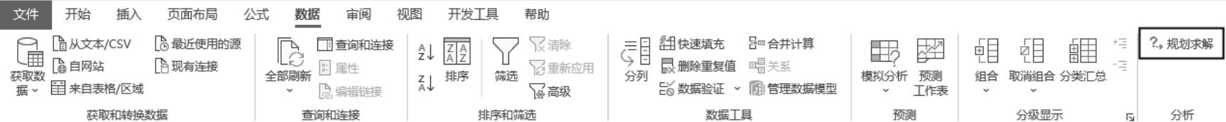分析数据的目的是从大量数据中发现有价值的信息,最终形成有效的观点或结论,为个人或企业做出明智的决策提供帮助。Excel提供了大量的分析工具,使用这些工具可以对数据进行不同类型的分析。为了便于描述和记忆,本节对Excel中的分析工具进行了分类,并简要介绍它们的功能和特点,以及在Excel界面中的位置,本书后续章节会详细介绍这些工具的用法。