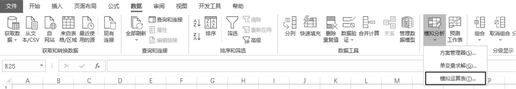 “模拟分析”工具位于Excel功能区的“数据”选项卡中,如图1-9所示。使用该工具可以基于现有的计算模型,对影响最终结果的多种因素进行预测和分析,从而得到最接近目标的方案。