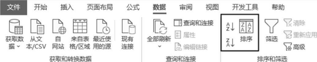 “排序”工具位于Excel功能区的“数据”选项卡中,如图1-3所示。使用该工具可以对数据按升序、降序或自定义顺序排列,以便了解数据的分布规律,快速找出数据中的最大值和最小值。“排序”工具可以在普通数据区域和数据透视表中使用。