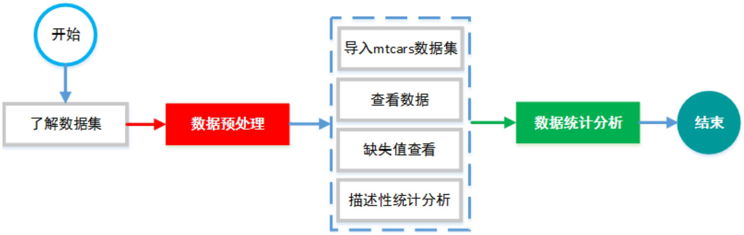 汽车数据可视化分析系统使用了R语言自带的数据集,因此首先需要了解数据集,然后进行数据预处理工作,即导入mtcars数据集、查看数据、缺失值查看与描述性统计分析,以确保数据质量,最后进行数据统计分析。