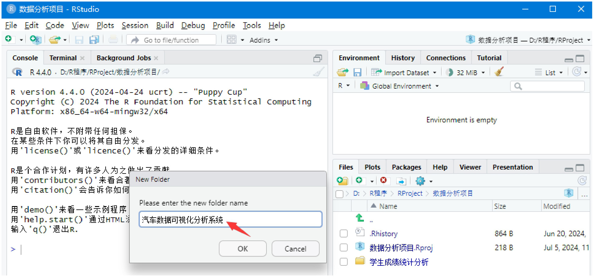 在开发本项目前应在工程(如数据分析项目.Rproj)所在文件夹中新建一个项目文件夹(如“汽车数据可视化分析系统”),以保存项目所需的R脚本文件,实现过程如下。
