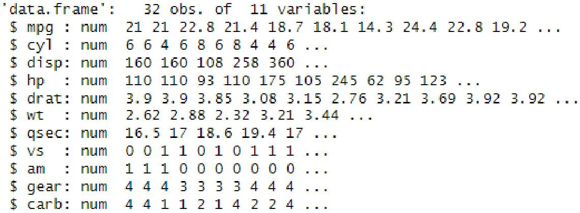 library(datasets) # 加载程序包 data(mtcars) # 导入 mtcars 数据集