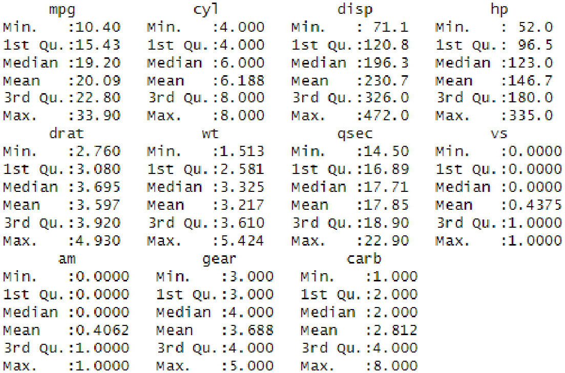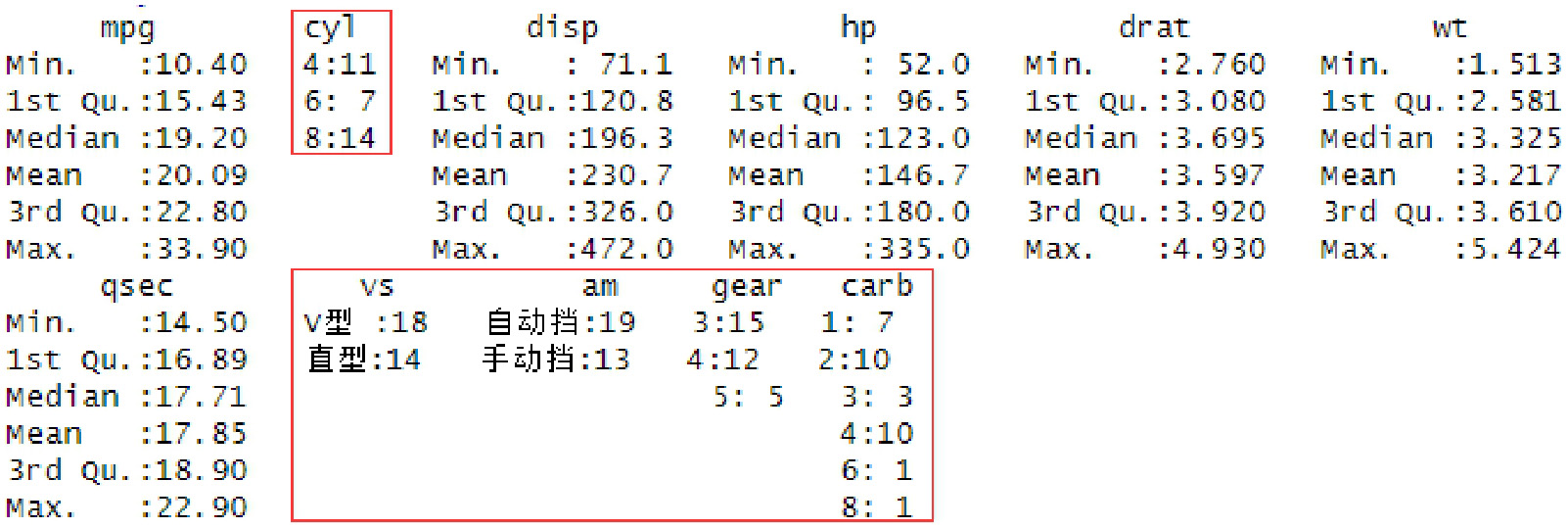 从运行结果得知:cyl、vs、am、gear和carb分类变量中各个值的数量都被统计出来了。例如,32辆汽车中,4缸11辆、6缸7辆、8缸14辆;发动机缸体V型18辆,直型14辆;自动挡19辆,手动挡13辆。