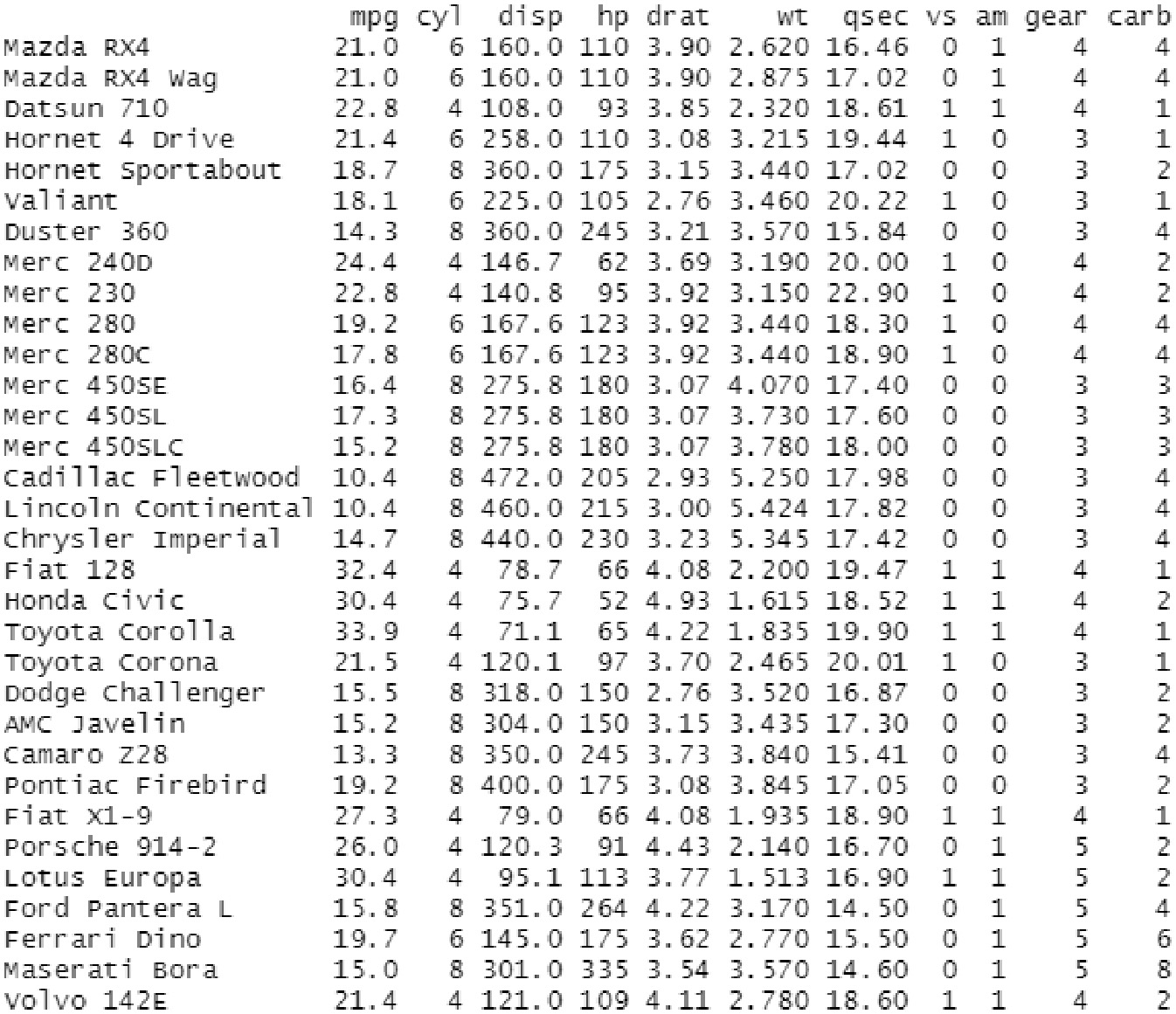 library(datasets) # 加载程序包 data(mtcars) # 导入 mtcars 数据集