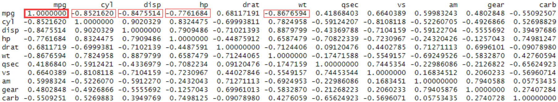 从运行结果得知:mpg(里程数)与mpg(里程数)自身的相关性是1,与cyl(气缸数)、disp(排量)、hp(总马力)和wt(重量)存在着负相关性,并且相关性较强。