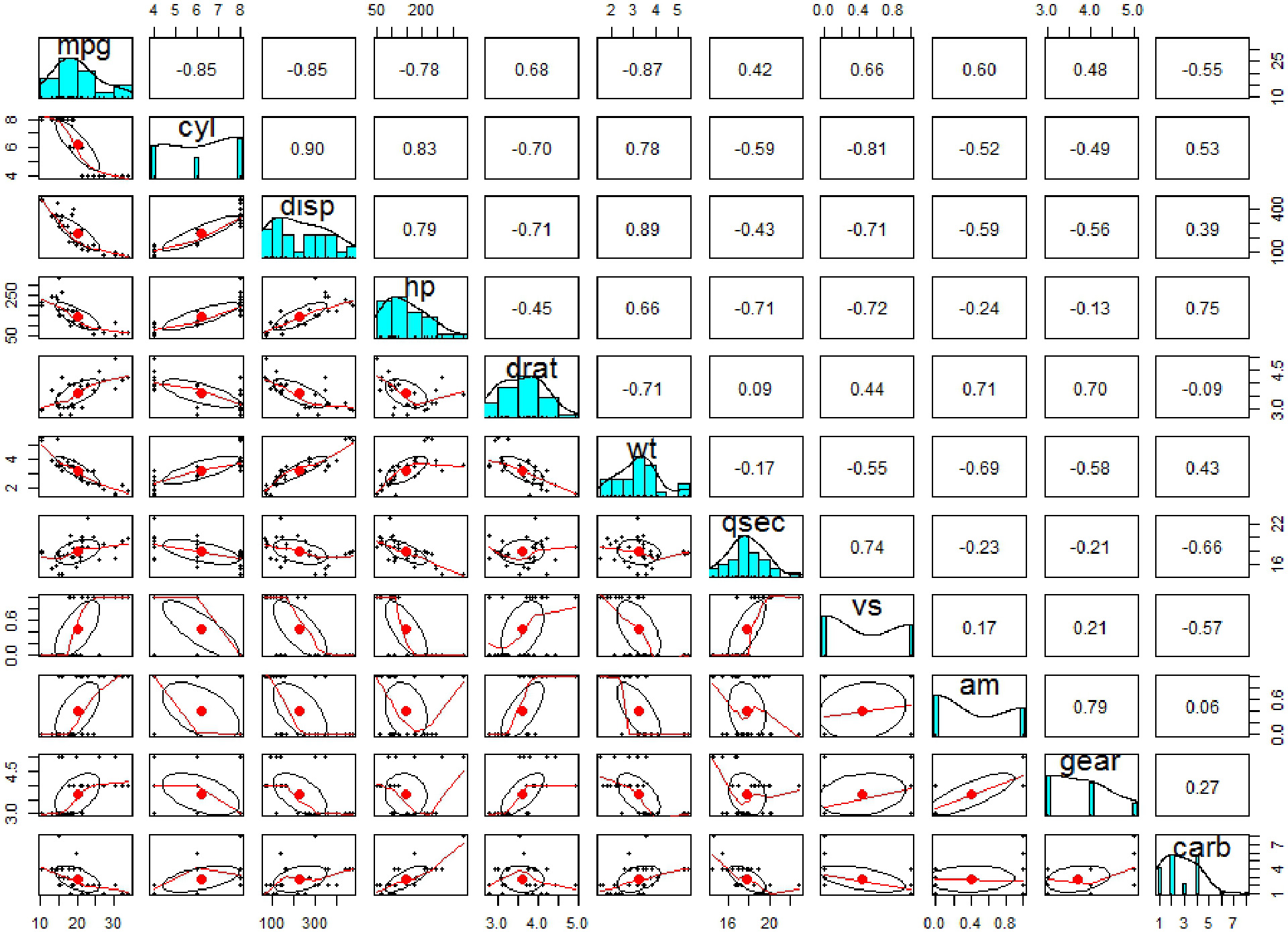 从运行结果得知:对角线上方为相关系数矩阵,mpg(里程数)与气缸数(cyl)、排量(disp)、总马力(hp)和重量(wt)有较强的负相关性,也就是说气缸数、排量、总马力和重量越大,汽车里程数越少,即每加仑油英里数越少,表示汽车越耗油;对角线为每个变量数值分布的直方图;对角线下方为散点图,每个散点图中的椭圆表示两个变量的相关性,椭圆越扁,变量之间的相关性越强;每个散点图中的曲线都为局部回归曲线;每个散点图中位于椭圆中心的点都为两个变量均值所确定的点。