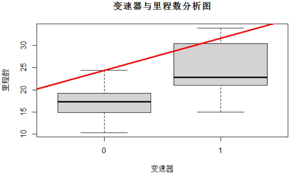 运行程序,结果如图2.19所示。(4)在箱形图中添加一条回归线进一步分析是否自动挡更费油,使用abline()函数实现,代码如下:
