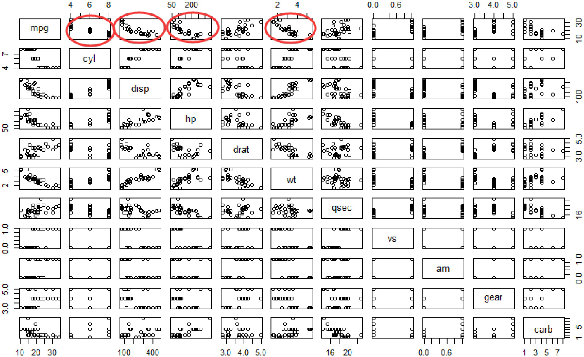 从运行结果得知:虽然散点图矩阵中的散点图非常多,但大致可以看出mpg(里程数)与cyl(气缸数)、disp(排量)、hp(总马力)和wt(重量)存在一定的线性关系。
