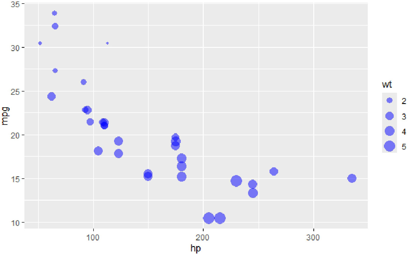 # 加载程序包 library(ggplot2) df <- mtcars # 绘制气泡图 ggplot(df, aes(x=hp, y=mpg, size=wt)) + geom_point(shape=16, color="blue", alpha=0.5)