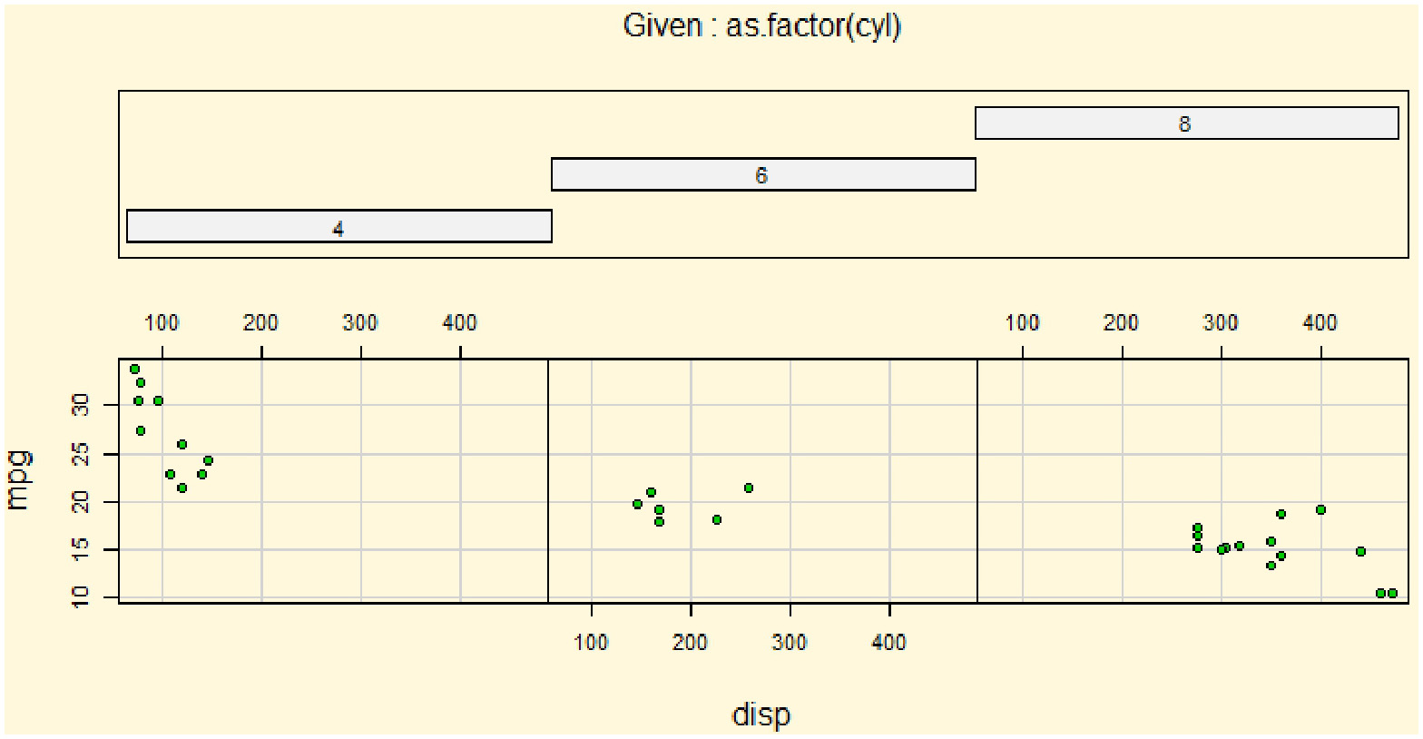 coplot(mpg ~ disp | as.factor(cyl),data = mtcars,