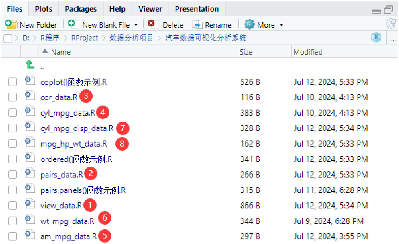 通过前述步骤,设计并完成了“汽车数据可视化分析系统”项目的开发,项目文件夹中包括11个R脚本文件,如图2.24所示。