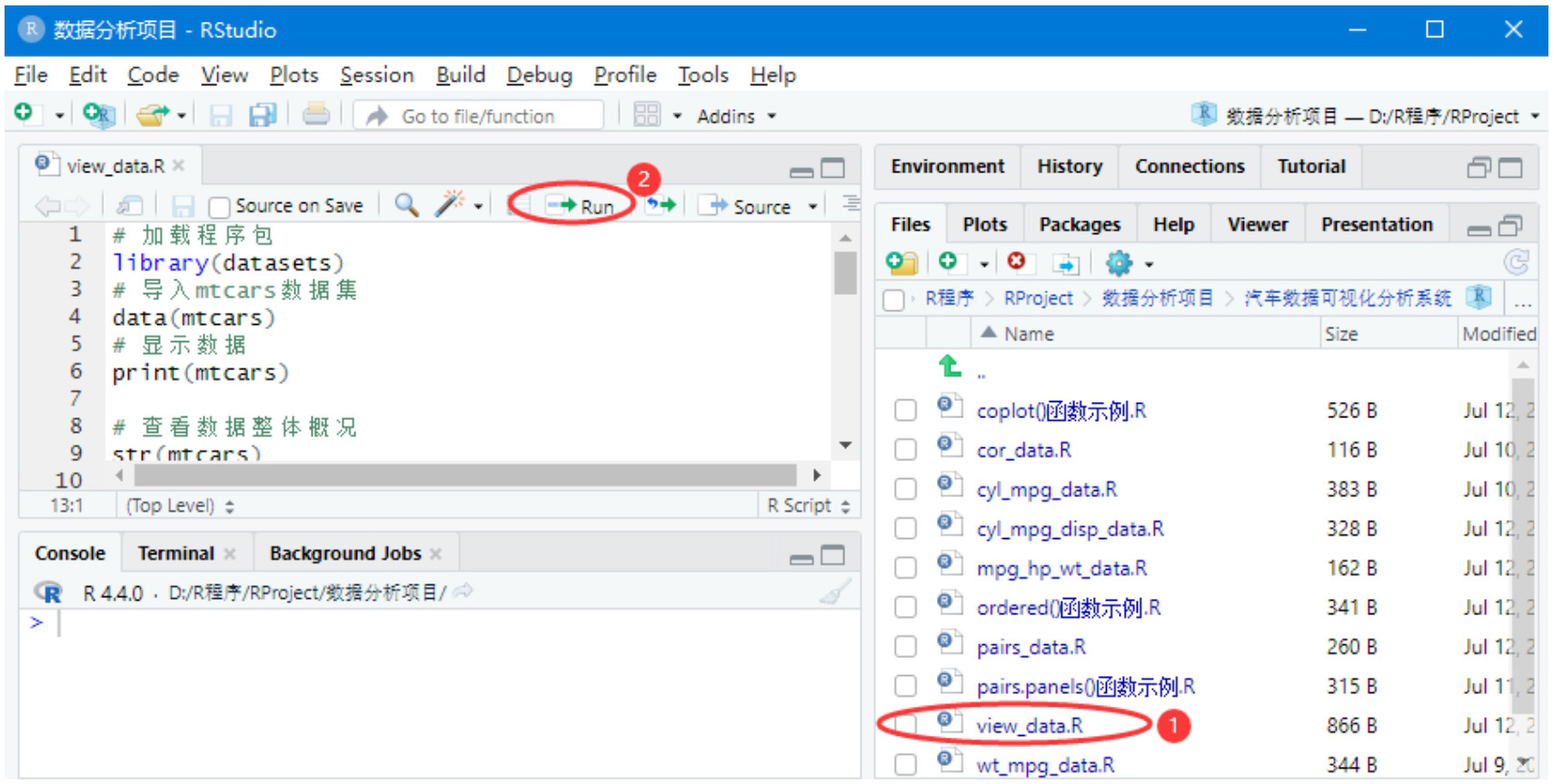 下面按照开发过程运行脚本文件,检验一下我们的开发成果。例如,运行view_data.R,首先单击Files面板,然后在列表中单击view_data.R,在代码编辑窗口中单击Run按钮,运行光标所在行,如图2.25所示。或者单击Source按钮,运行所有行。