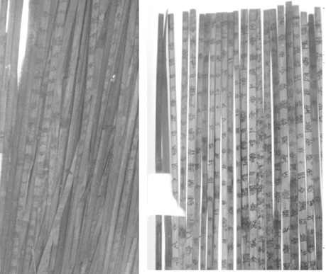 During the preservation and photographic work, the editorial team was able to arrive at some preliminary understanding of the content of the slips.Nevertheless, it was only after that work was completed that editorial work could begin in earnest.The first order of business was to identify how many different discrete texts there were, and which slips belonged to which texts.Because the slips had been robbed from a tomb, when they arrived at Tsinghua University, they had become largely separated from their original context.Thus, the identification of texts depended on the sort of typological analysis that archaeologists usually employ: placing slips of similar length and width together; noting the locations of the straps that were used to bind them together (sometimes leaving a distinct mark on the bamboo, and usually marked as well by small notches on the side of the bamboo intended to keep the strap from sliding up and down on the slip); identifying paratextual features of the slips (placement of text above or below the top and bottom binding strap, the presence or absence of numbers indicating the sequence of the slips, the use and types of punctuation, as well as features on the reverse side of the slips including the presence or absence of titles, diagonal slash marks presumably made during the preparation of the slips, and occasional “ghost” characters left imprinted from other slips); and examination of the calligraphy (assuming that a discrete text would feature a consistent calligraphic hand).After placing slips into groups of these features, the editors turned finally to their content.In this regard, they were often able to rely on comparisons with received literature to identify text that continued from one slip to another.Often of crucial importance in this respect was sequence numbers found on the bottom or reverse side of numerous slips, a feature seen for the first time with the Tsinghua manuscripts.