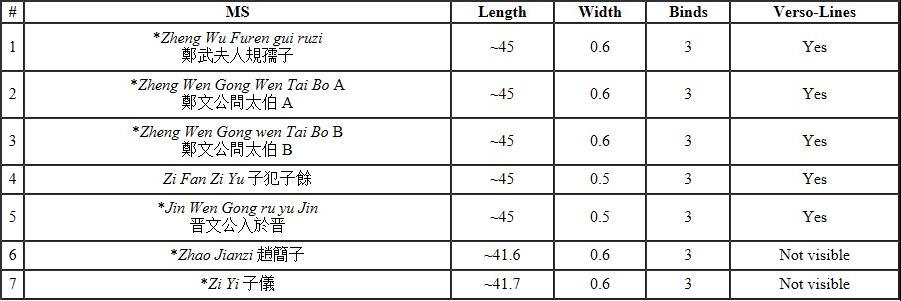 [9] The data is drawn from the source publications and Li Songru李松儒,“Qinghua qi Zi Fan Zi Yu yu Zhao Jianzi deng pian ziji yanjiu”清華七《子犯子餘》與《趙簡子》等篇字迹研究, Chutu wenxian 出土文献 15 (2019): 177–192; she also provides data on the relative spacing of the binds.Length and width in cm.