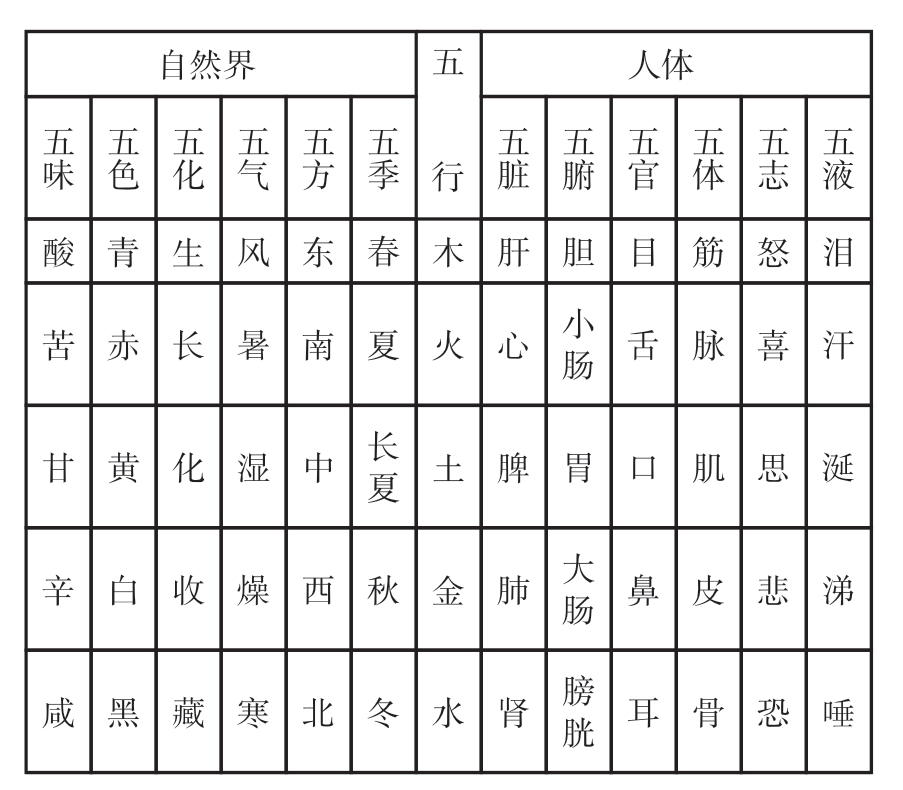 《素问·金匮真言论》与《素问·阴阳应象大论》等篇中的五行归类,是基于事物内在的运动方式、状态或显象的同一性而进行的。如《素问·金匮真言论》所述的“东方青色,入通于肝,开窍于目……其应四时,上为岁星……其臭臊”,是将在天的方位、季节、气候、星宿、生成数,在地的品类、五谷、五畜、五音、五色、五味、五臭,以及在人的五脏、五声、五志、病变、病位等进行五行归类,这样就可以通过类别之间“象”的普遍联系,来识别同类运动方式的共同特征及其相互作用规律。这是“同气相求”的体现,而非简单的物质结构等量齐观。