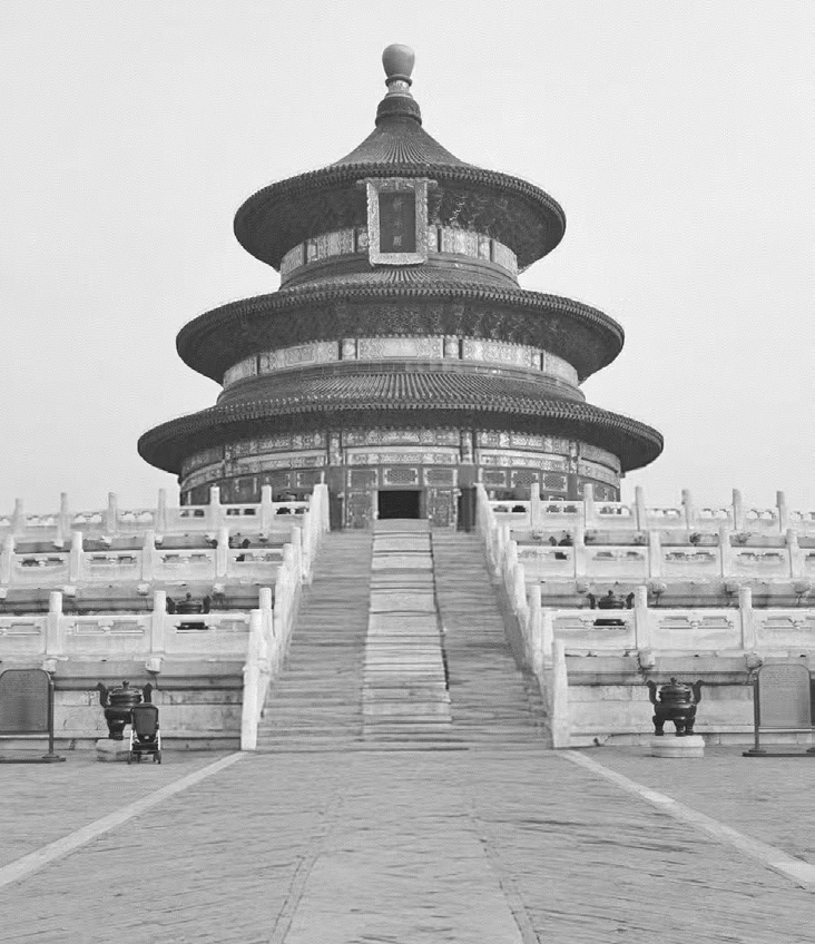 这种将年、季、月等数的概念用于建筑者,世界各国皆有,但在中国尤为显著。明清时建造的北京天坛祈年殿(图1-6),四周墙垣为方形,而祈年殿本身则为圆形平面,寓意“天圆地方”。屋顶用蓝色琉璃,象征着此殿与湛蓝天空相接,皇帝祈求“风调雨顺、国泰民安”的祈愿,仿佛“上天”更易听到。殿内柱子的排列和数目,都和天象紧密相连:中间四根通天柱,象征一年有春、夏、秋、冬四季;第二圈十二根金柱,代表一年中的十二个月;外圈十二根檐柱,则代表一日分子、丑、寅、卯等十二个时辰。金柱、檐柱共二十四根,寓意一年有二十四个节令;三圈柱子共二十八根,代表周天二十八宿。整幢祈年殿包括顶部八根童柱在内,共有三十六根柱子。宝顶下一根坚实的雷公柱,则寓意皇帝“一统天下”的权威。