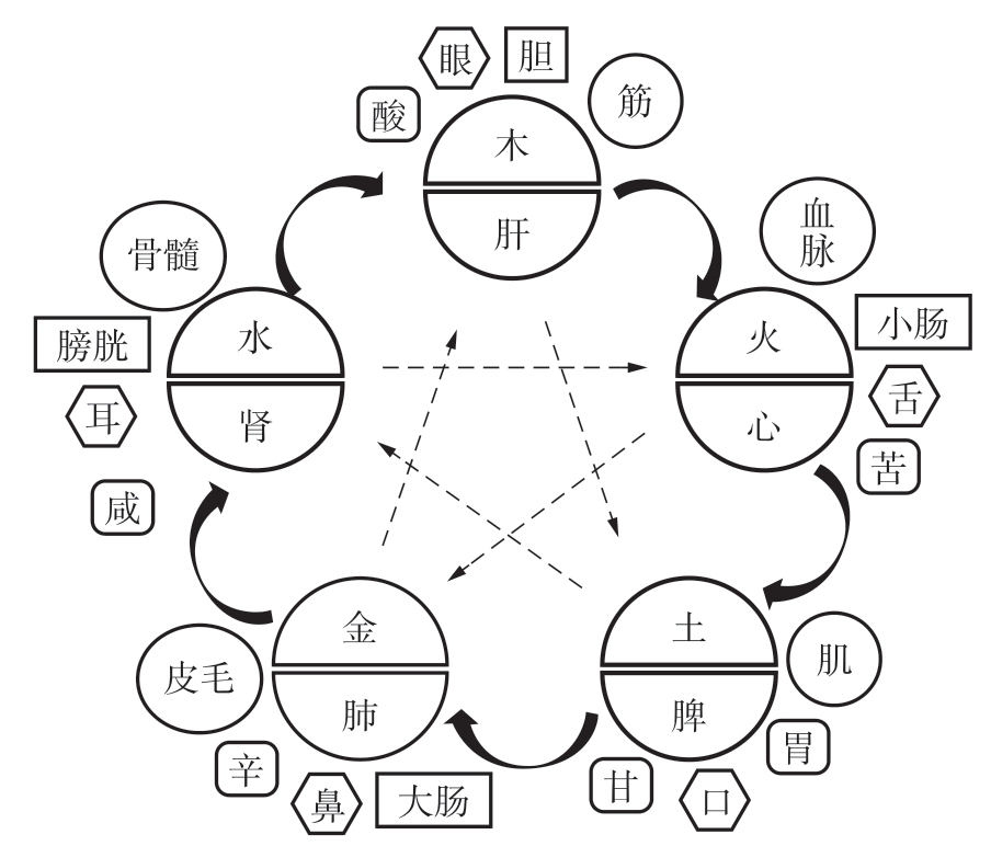 在中医理论中,五行被视为宇宙间共通的结构关系。天地宇宙之间的一切事物均禀受五行之气,其运动变化亦遵循五行之理,人亦不例外。《灵枢·通天》曰:“天地之间,六合之内,不离于五,人亦应之。”《素问·阴阳应象大论》描述详尽:“东方生风,风生木,木生酸,酸生肝,肝生筋,筋生心,肝主目。其在天为玄,在人为道,在地为化。化生五味,道生智,玄生神,神在天为风,在地为木,在体为筋,在脏为肝,在色为苍,在音为角,在声为呼,在变动为握,在窍为目,在味为酸,在志为怒。怒伤肝,悲胜怒;风伤筋,燥胜风;酸伤筋,辛胜酸。南方生热,热生火,火生苦,苦生心,心生血,血生脾,心主舌。其在天为热,在地为火,在体为脉,在脏为心,在色为赤,在音为徵,在声为笑,在变动为忧,在窍为舌,在味为苦,在志为喜。喜伤心,恐胜喜;热伤气,寒胜热;苦伤气,咸胜苦。中央生湿,湿生土,土生甘,甘生脾,脾生肉,肉生肺,脾主口。其在天为湿,在地为土,在体为肉,在脏为脾,在色为黄,在音为宫,在声为歌,在变动为哕,在窍为口,在味为甘,在志为思。思伤脾,怒胜思;湿伤肉,风胜湿;甘伤肉,酸胜甘。西方生燥,燥生金,金生辛,辛生肺,肺生皮毛,皮毛生肾,肺主鼻。其在天为燥,在地为金,在体为皮毛,在脏为肺,在色为白,在音为商,在声为哭,在变动为咳,在窍为鼻,在味为辛,在志为忧。忧伤肺,喜胜忧;热伤皮毛,寒胜热;辛伤皮毛,苦胜辛。北方生寒,寒生水,水生咸,咸生肾,肾生骨髓,髓生肝,肾主耳。其在天为寒,在地为水,在体为骨,在脏为肾,在色为黑,在音为羽,在声为呻,在变动为栗,在窍为耳,在味为咸,在志为恐。恐伤肾,思胜恐;寒伤血,燥胜寒;咸伤血,甘胜咸。”