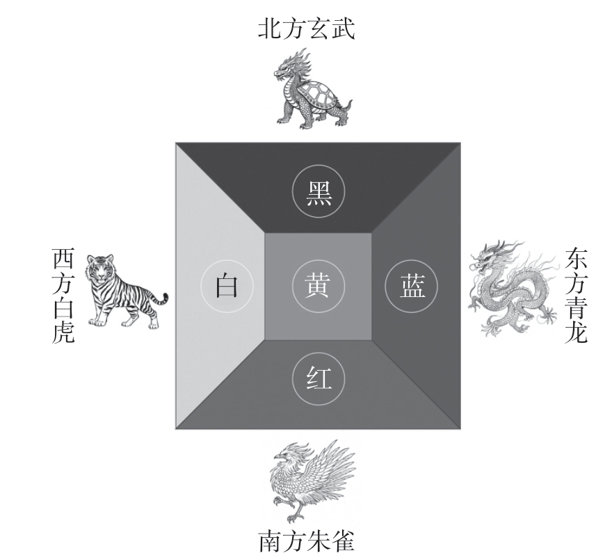 古代关于方位(东、南、西、北、中)的说法蕴含多重意义,既代表五行,即金、木、水、火、土;又象征季节,东为春,南为夏,西为秋,北为冬;还表征属性,东属龙,西属虎,南属凤,北属龟。在中国古典小说和戏曲中,常可见到或听到这样的表述,即“左青龙、右白虎、前朱雀、后玄武”。其中,朱雀常被视为凤凰的化身。至于玄武说法各异,有的地方认为玄武即龟,寓意长寿,而四川芦山县发掘的汉墓王晖石棺,其北侧雕的却是“龟蛇纠缪”的图案,郭沫若先生对其给予了很高的评价,他认为其艺术价值可与法国雕塑家罗丹的著名作品“吻”及意大利文艺复兴时期米开朗基罗创作的关于天国生活的诸多雕塑相媲美。