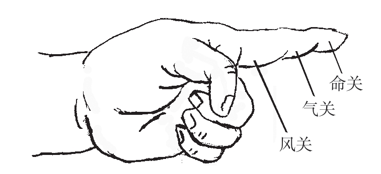 小儿食指络脉诊法是3岁以下婴幼儿常用的诊断方法,也是儿科的特色诊法之一(图2-3)。自宋代提出食指络脉诊法以来,历代医家均有阐述。滑寿在其著作《诊家枢要》“小儿脉”篇中明确指出:“小儿三岁以下,看虎口三关纹色:紫,热;红,伤寒;青,惊风;白,疳病。惟黄色隐隐,或淡红隐隐,为常候也。至见黑色,则危矣。其他纹色,在风关为轻,气关渐重,命关尤重也。”至今我们在临床上仍基本沿用该部分内容。这不仅是通过观察小儿络脉颜色进行察色辨证的重要发展,也为我们将小儿食指络脉诊法的颜色观察与小儿疾病进行对应提供了依据。
