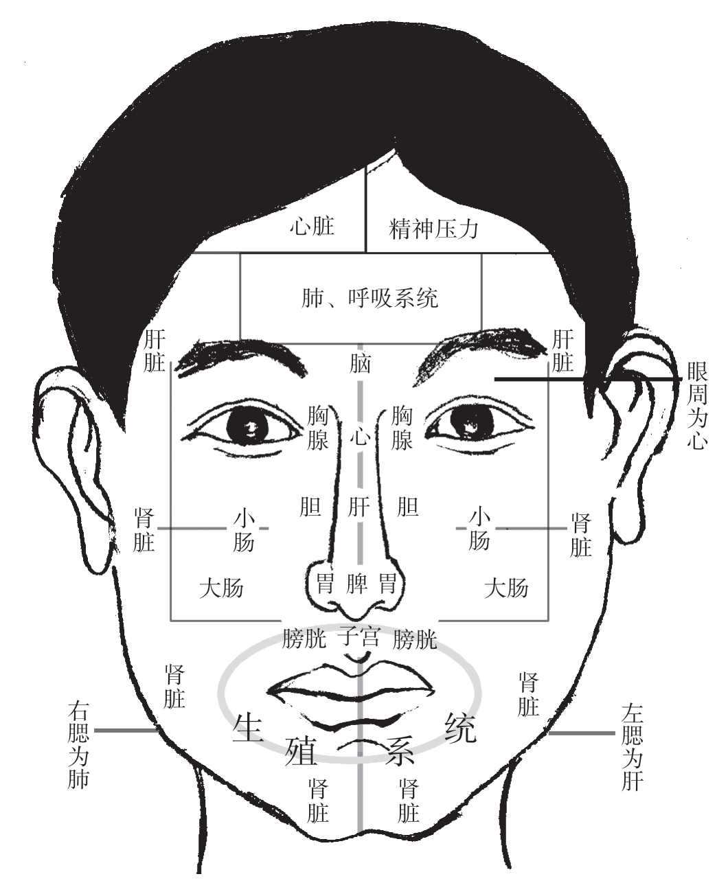 (1)色诊的原理及意义 面部是所有经络和气血的上注之地,被认为是中医色诊的主要诊察部位,《灵枢·邪气脏腑病形》曰:“十二经脉,三百六十五络,其血气皆上于面而走空窍。”面部的五色是正常人可以用眼睛看到的,《素问·五脏生成》曰:“五色微诊,可以目察。”