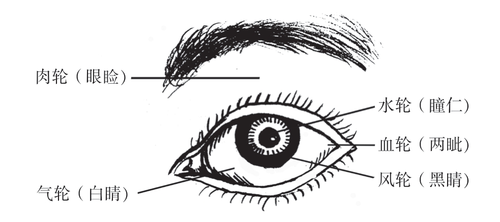 察目诊病,主要是通过察看眼睛各部位的病理变化来诊断相关疾病,辨别病位、病性,并推测疾病之预后。《素问·五脏生成》说:“诸脉者皆属于目”,目为肝之窍,乃宗脉之所聚。《灵枢·大惑论》说:“五脏六腑之精气,皆上注于目而为之精。”《灵枢·小针解》说:“上工知相五色于目”。五轮诊法之五脏分布有一定规律,古人将目之不同部位分属于五脏,此说最早始于《灵枢·大惑论》,曰:“精之窠为眼,骨之精为瞳子,筋之精为黑睛,血之精为络,其窠气之精为白睛,肌肉之精为约束……”后世医家据此进一步归纳如下:瞳仁属肾,称为水轮;黑睛属肝,称为风轮;两眦血络属心,称为血轮;白睛属肺,称为气轮;眼睑属脾,称为肉轮(图2-2)。这些理论对眼科临床和内科疾病的诊断均具有一定的指导意义。