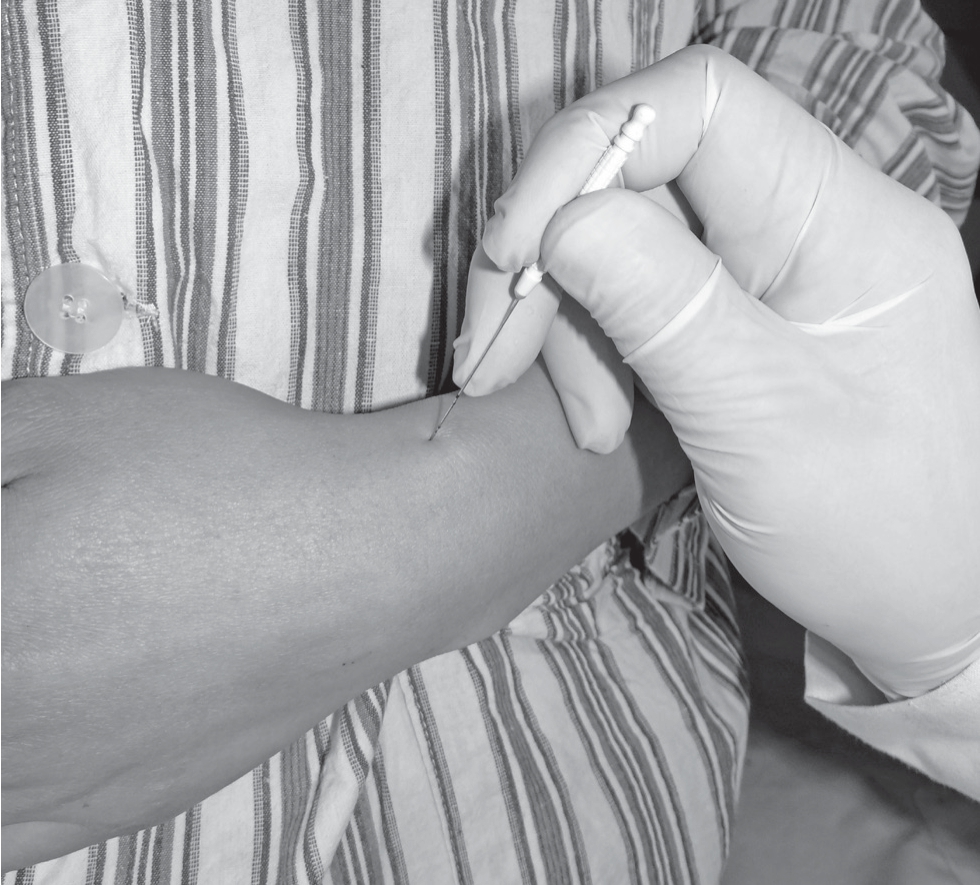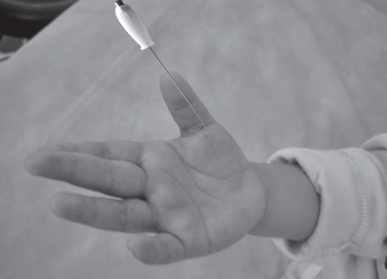 末端筋膜叩刺法是选取微型小号水针刀,于四肢末端筋膜间隙和指节末端的筋膜点,快速叩刺3~6针,以松解末端筋膜间隙(图1-15),或者捻转叩刺放血,以治疗肢体疼痛、麻木。对于慢性单纯麻木者可以仅微叩浅刺不放血,以调整末梢神经功能。