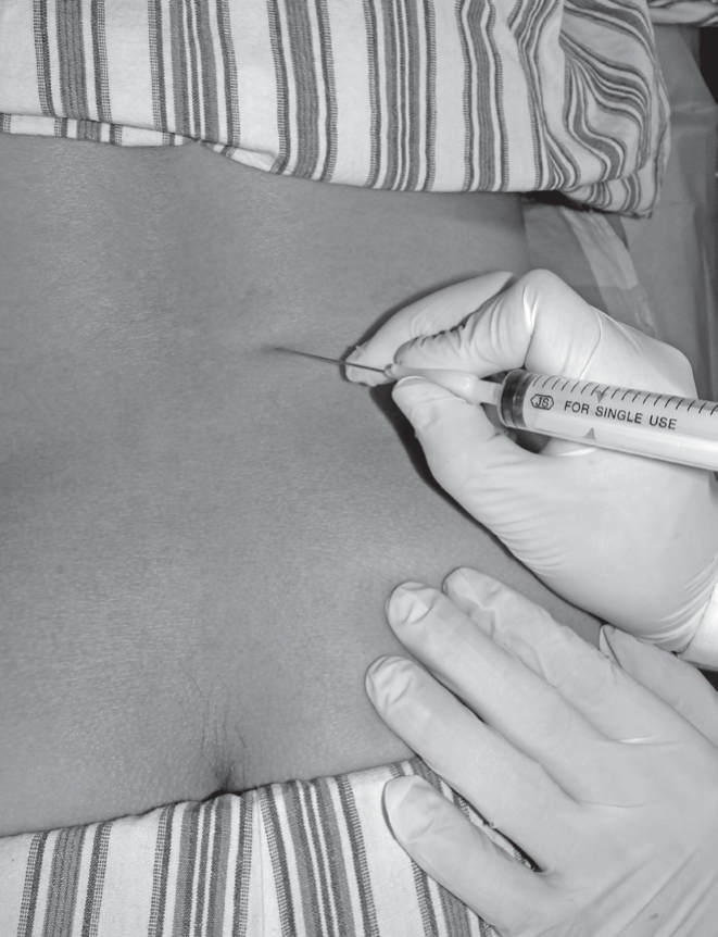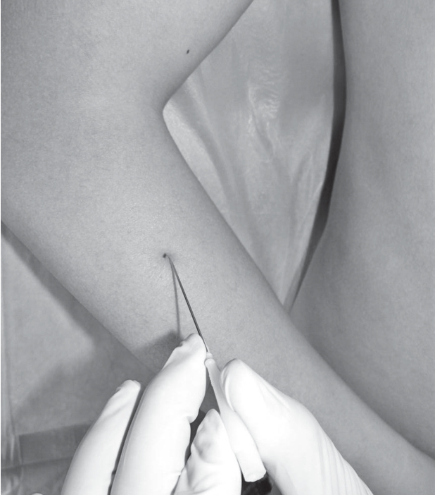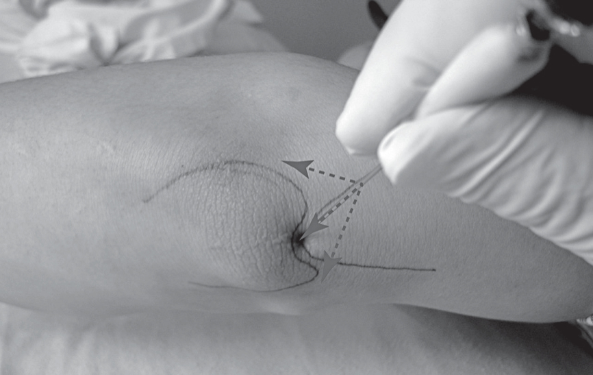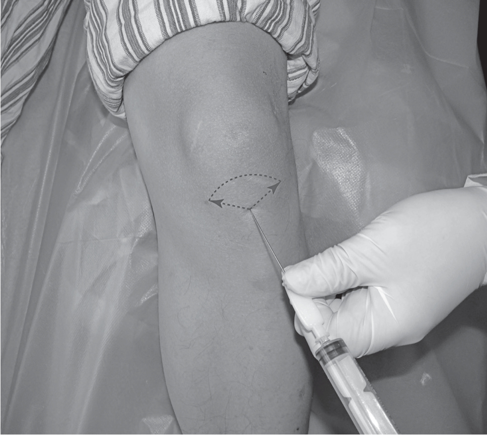一点三针松筋法是选取樱枪形水针刀,采用一点三针法进针入路,进入囊腔后回抽滑液,注射磁化松解液,然后向三维方向通透分离(图1-14)。本法临床主要用于治疗滑囊炎、滑膜炎及滑膜积液等。