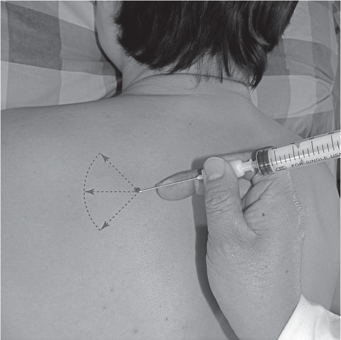 筋膜扇形松筋法传承于传统针法的青龙摆尾针法,主要用于治疗软组织损伤疾病。临床应用时可选用扁圆刃水针刀,在胸背部结节处斜刺进针,达筋膜层后,行扇形松筋法(图1-11)。