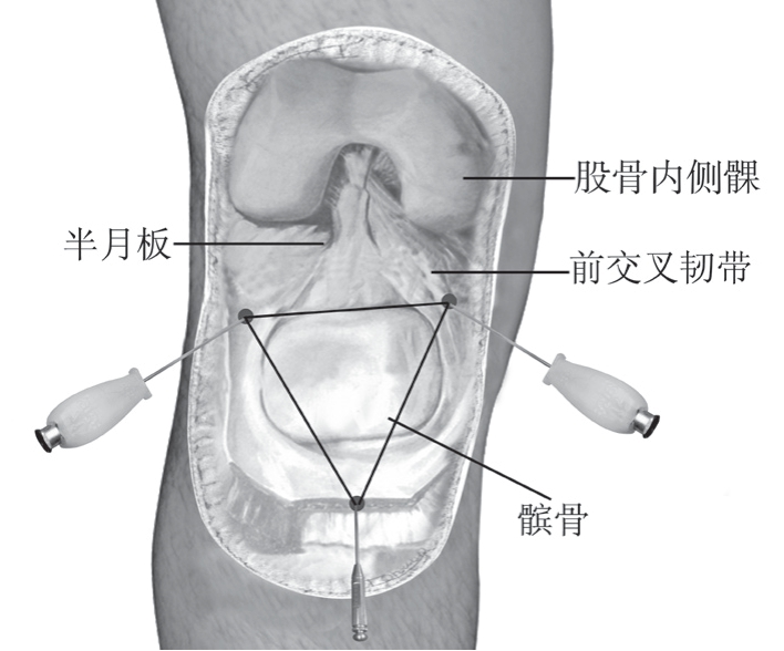 水针刀疗法治疗点的选择,是临床取得疗效的关键。吴汉卿教授根据人体生物力学、生物病理学原理,三点决定一个平面、三点决定一个三角区,以及人体骨骼系统的稳定依靠软组织中肌腱、筋膜、韧带的固定,来维系人体骨骼框架平衡稳定的原理,总结出软组织立体三角定位法。如对骨关节病变的治疗,吴汉卿教授根据人体软组织立体三角平衡学原理学说,采用筋骨三针疗法及水针刀疗法在骨关节周围选择治疗点,一般在关节周围进行三针定位(图2-3)。