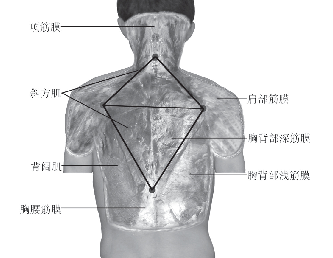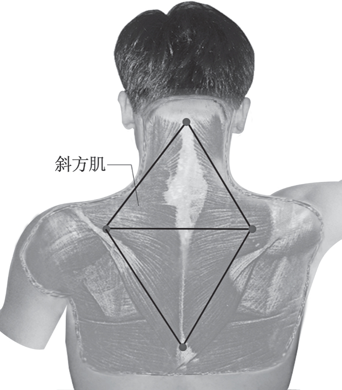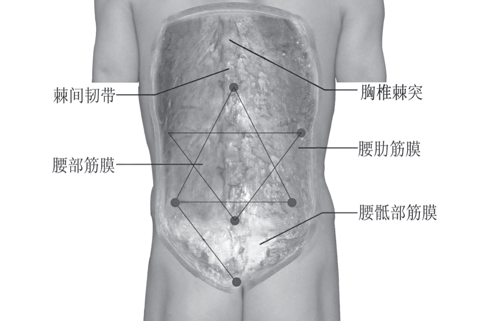胸背部筋膜立体三角区包括由双侧肩胛冈外上筋结点与第11胸椎棘突筋结点构成的三角区,以及由双侧游离肋尖筋结点与第11胸椎棘突筋结点构成的三角区。这些筋结点既是病理学损伤点,也是水针刀疗法的治疗点(图2-14)。